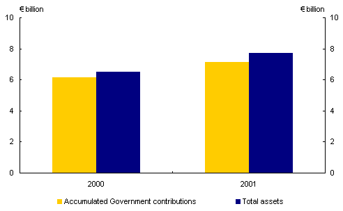 The National Pensions Reserve Fund was established in 2001, and held assets totalling Euro 7.7 billion (US$7.5 billion) at December 2001 (Chart 43). It is expected that the Fund will grow to Euro 40 billion by 2025.