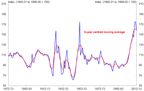 The commodity price boom delivered a huge windfall income gain to Australia. Professor Garnaut argues that it was squandered, contributing to a loss of economic reform momentum during what he describes as ‘the Great Complacency’. With commodity prices now falling as supply capacity comes online, Professor Garnaut’s thesis is that the Australian economy faces a hard landing in the absence of bold productivity-enhancing reform.2