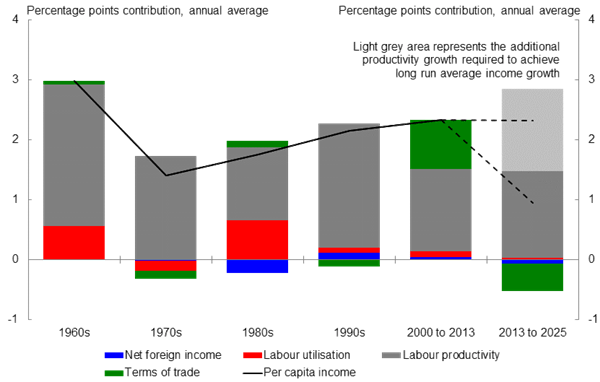 Second, it seems likely that income growth will be sluggish for some time. Assuming an average productivity performance, income for the average citizen is likely to grow more slowly over the next decade or so than it has in each of the previous five decades, predominantly as a consequence of the expected further decline in the terms of trade (Chart 9).