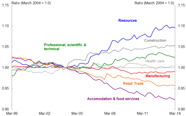 Note: Industry WPIs (Wage Price Indexes) relative to the aggregate WPI, indexed to 1 in March 2004.